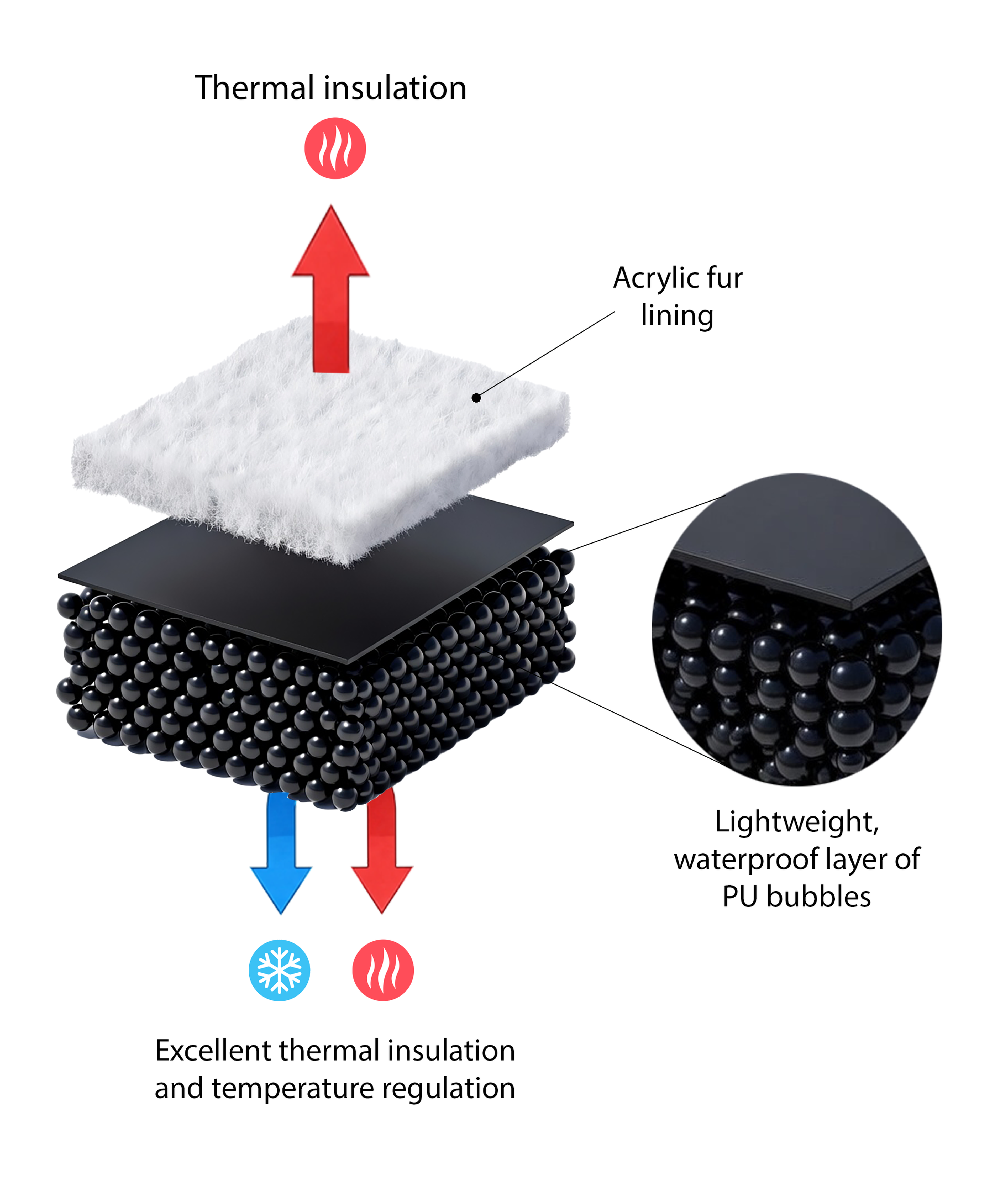 Materialet inneholder millioner av mikroskopiske luftbobler, som skaper naturlig varmeisolasjon som er lett og svært effektiv til å holde på varmen og stenge kulden ute.